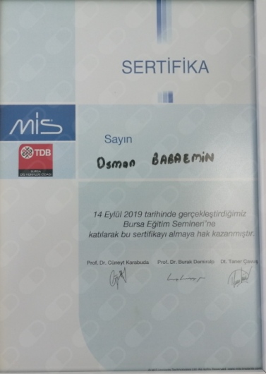 DT. Osman Babaemin 2019 Aralık ayından bu yana Bursa Özlüce’ de ki özel kliniğinde hasta kabul etmektedir. Başlıca mesleki ilgi alanları kompozit veneer uygulamaları, dijital gülüş tasarımı uygulamaları, estetik diş hekimliği uygulamaları, bonding, endodontik uygulamalar gelmektedir.